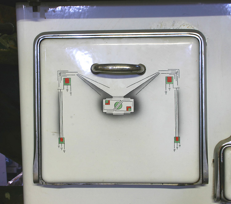 Bei diesem schlichten antiken Küchenherd aus dem Art deko ist die Feuerung in der Mitte und wird von oben beschickt. Der gusseiserne Feuerraum gibt zum Backen seine Wärme nach rechtsund links an die beiden Backofenräume ab.